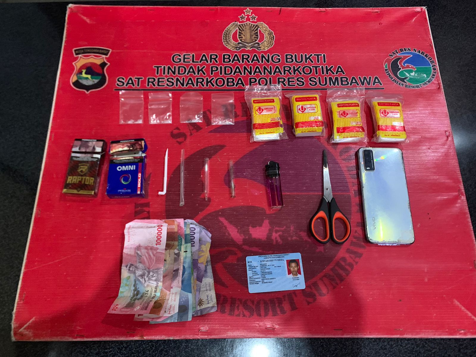 Saat dilakukan penggeledahan, petugas menemukan sejumlah barang bukti diantaranya 4 poket kristal putih yang diduga narkotika jenis shabu yang dibungkus dengan menggunakan plastik bening / transparan dengan berat brutto secara keseluruhan seberat 1,84 gram, 2 pipa kaca, 4 bendel klip obat kosong, 2 buah skop plastik, 1 buah korek gas, 1 buah gunting, 1 bungkus rokok merk raptor, 1 bungkus rokok merk omni, 1 unit hp android, uang tunai sejumlah Rp. 400.000 (empat ratus ribu rupBeiah).