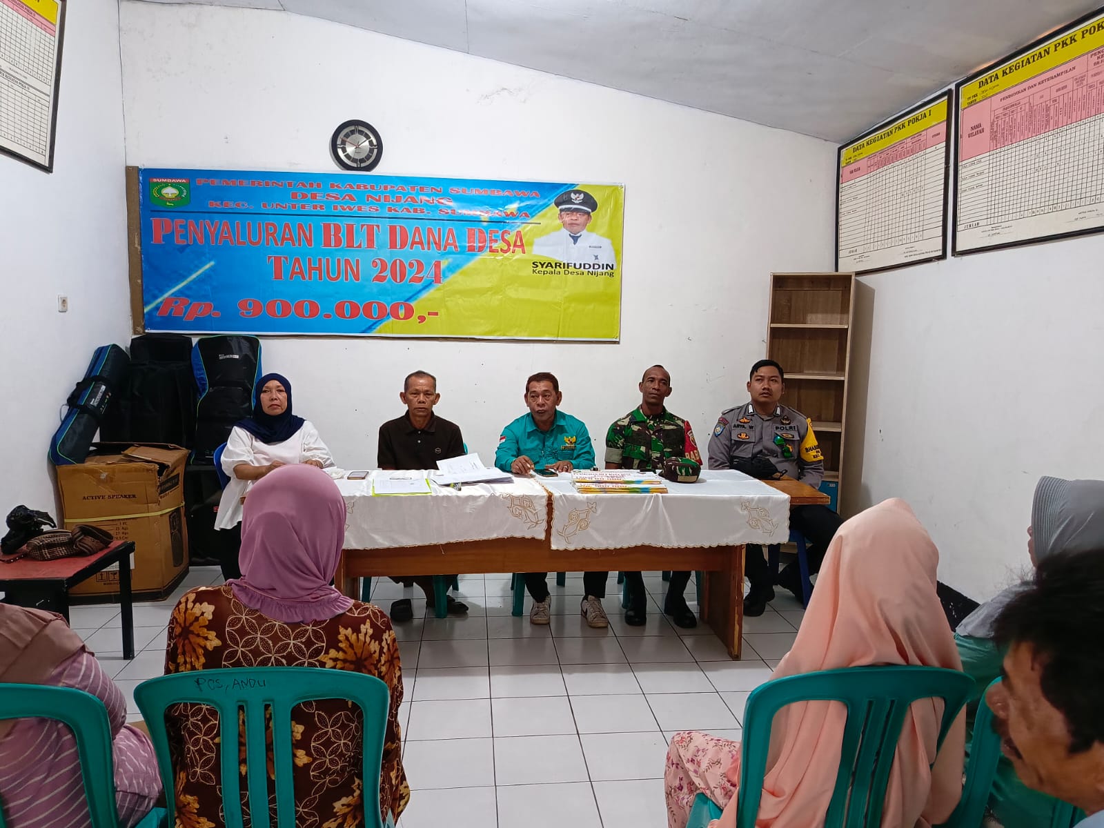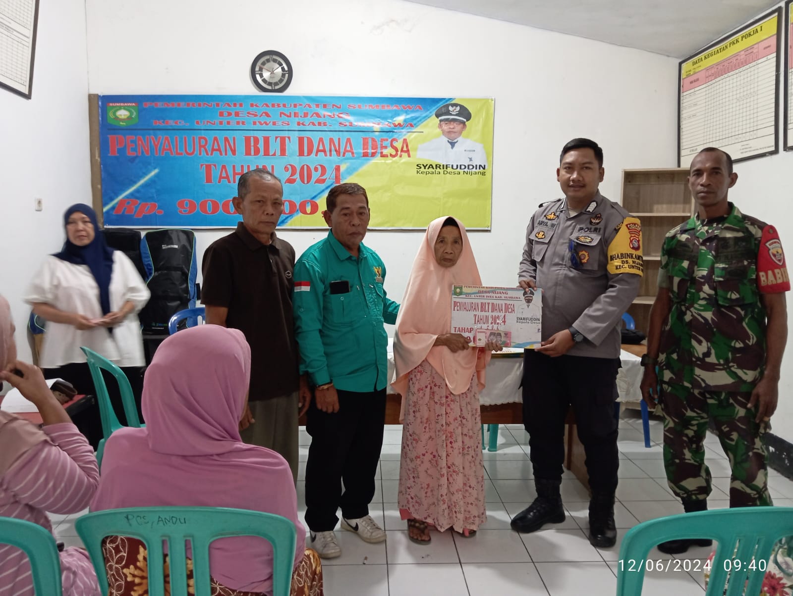 Sumbawa Besar-NTB, Bhabinkamtibmas Bripka Arya W bersama Babinsa Desa Nijang Sertu Jafar DF menghadiri kegiatan penyaluran BLD DD tahun 2024 bertempat di di Kantor Desa Nijang Kec. Unter Iwes, Rabu (12/06/24) pagi.