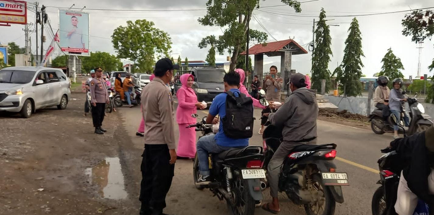 Bima, NTB (27/3) – Polsek KP3 Bandara Sultan Muhammad Salahuddin Bima Polres Bima Polda NTB bersama Ibu-Ibu Bhayangkari, mengadakan kegiatan bagi-bagi takjil untuk buka puasa kepada masyarakat yang sedang beraktivitas di jalan depan Mako Polsek KP3 Bandara SMS Bima Minggu 24/03/24 sekira pukul 17.00. WITA.