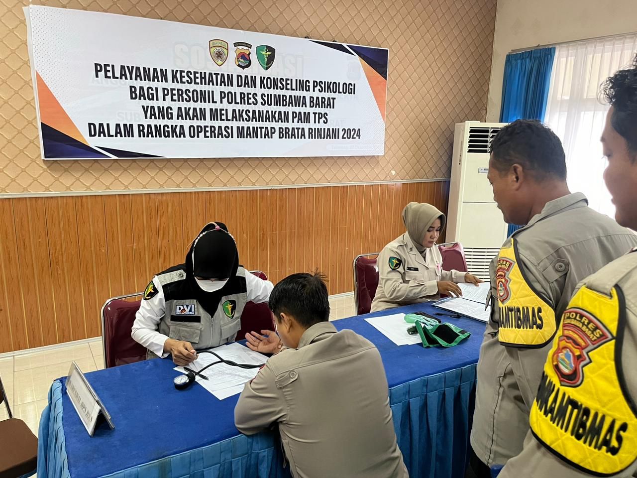 Sumbawa Barat – Bidang kesehatan Polres Sumbawa Barat melaksanakan pemeriksaan kesehatan Anggota Polres Sumbawa Barat yang terlibat PAM TPS dalam Rangka Ops Mantap Brata Rinjani 2024 dan Konsling Psikologi,bertempat di Aula Endra Dharmalaksana Polres Sumbawa Barat pada (29/01/24).