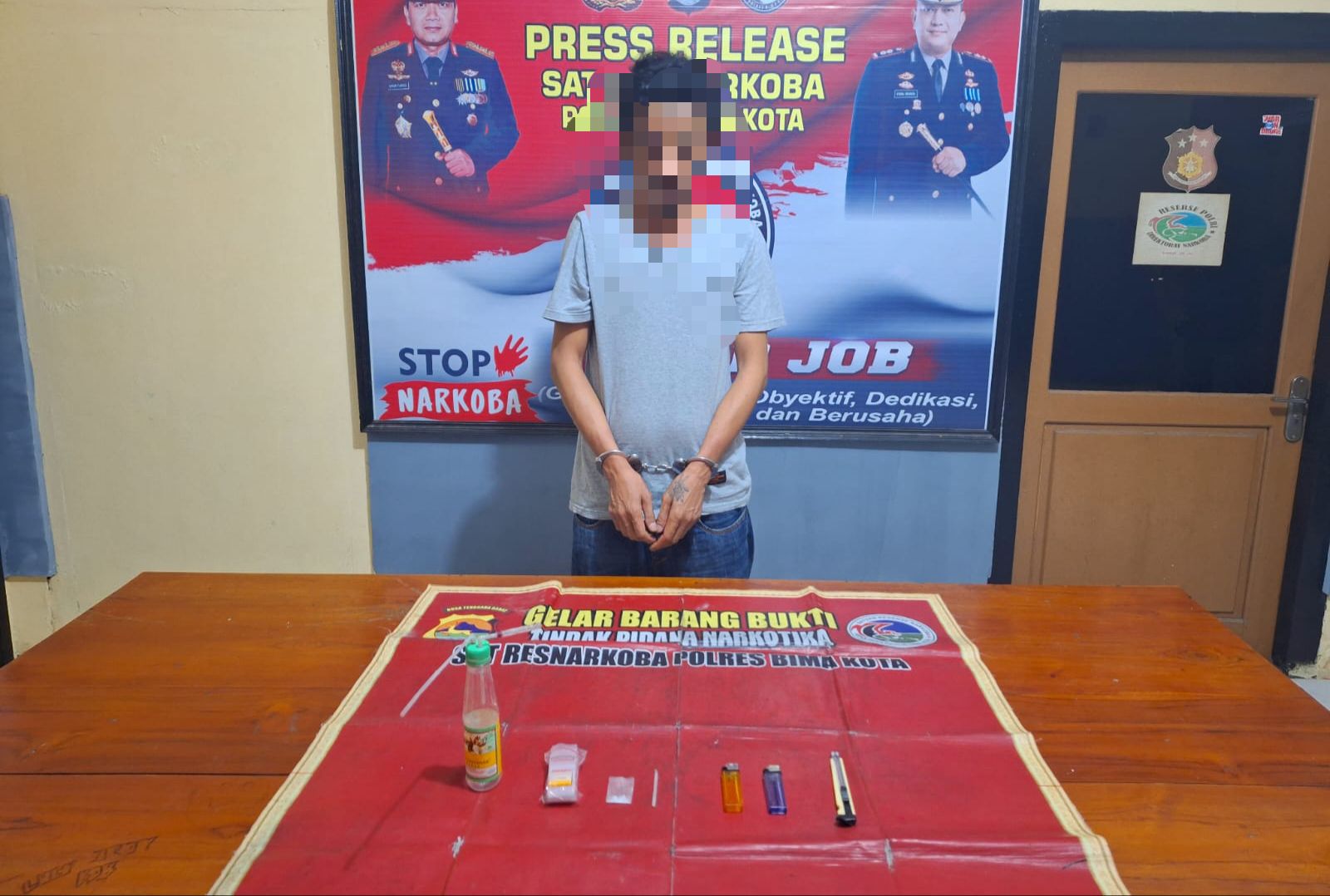 “Saat diringkus, ditemukan barang bukti berupa plastik klip berisi serbuk kristal yang diduga narkotika jenis sabu dengan berat bersih 0,48 gram, bong, plastik klip kosong, korek gas, dan pisau cutter,” jelas Kasat Resnarkoba.