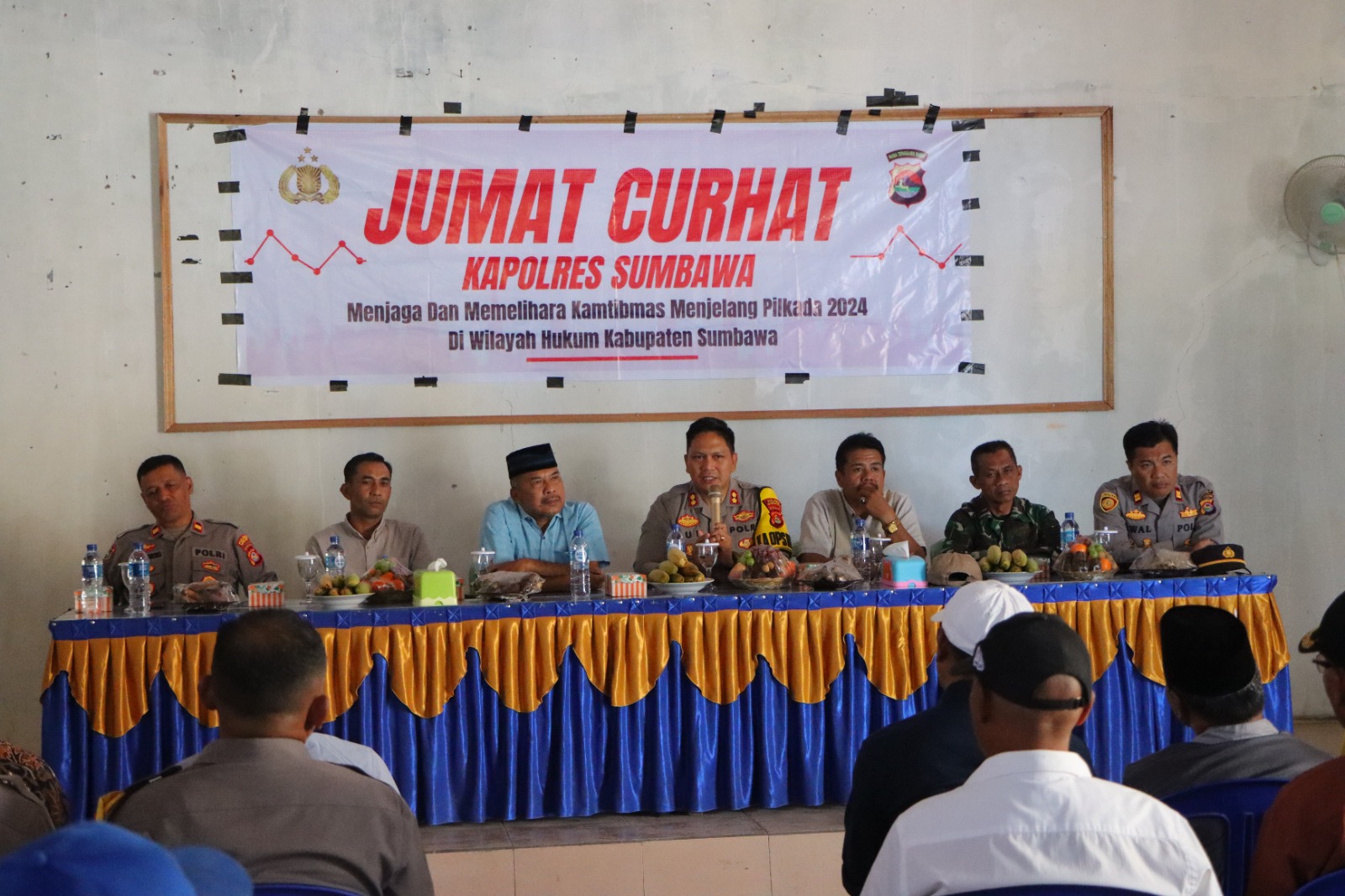 Sumbawa Besar-NTB, Kapolres Sumbawa AKBP Bagus Nyoman Gede Junaedi SH, S.IK, M.AP., didampingi Kasat Binmas dan Kapolsek Utan melaksanakan kegiatan Jumat Curhat bertempat di Aula serba guna Desa Jorok Kecamatan Utan, Jumat (30/08/24) pagi.