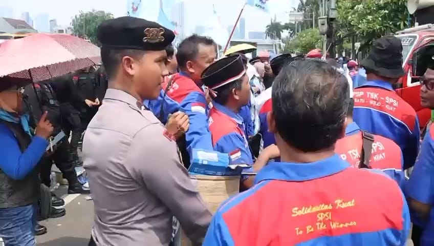Jakarta – Aksi simpatik ditunjukkan aparat kepolisian saat mengawal unjuk rasa buruh di depan Gedung DPR, Jalan Gatot Subroto, Jakarta Pusat, Senin (22/9/2025). Polisi membagikan air mineral dan roti kepada massa yang hadir. Gestur tersebut disambut positif oleh para buruh.