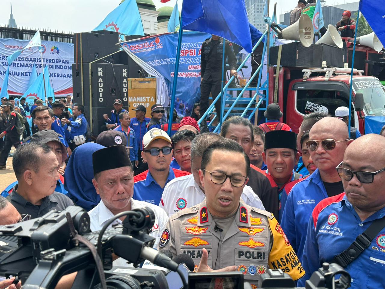 Jakarta – Polda Metro Jaya menyampaikan perkembangan situasi terkini terkait aksi penyampaian pendapat yang dilakukan oleh elemen buruh dari KSPSI dan KSPI di depan Gedung DPR/MPR RI.