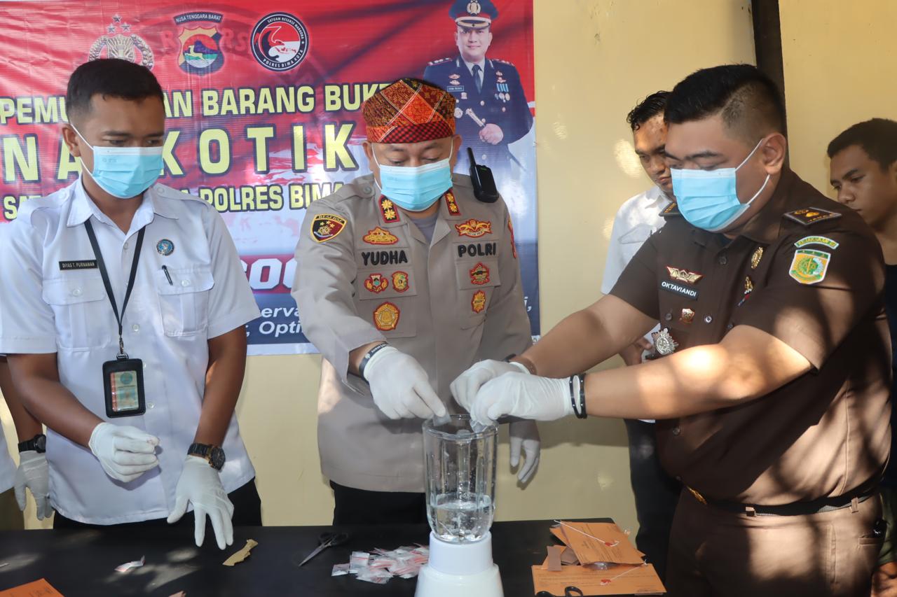 Pemusnahan barang bukti tersebut dipimpin langsung oleh Kapolres Bima Kota AKBP Yudha Pranata. Turut hadir dalam kegiatan ini sejumlah pejabat terkait, termasuk dari Pengadilan Negeri Bima, Kejaksaan Negeri Bima, BNNK Bima, Balai POM Bima, dan beberapa pejabat lainnya.