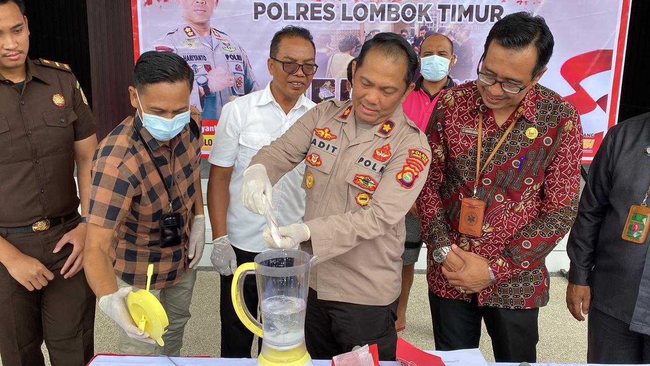 Disaksikan pejabat Kejaksaan Negeri Lombok Timur, PN Selong dan Dikes Lotim, barang bukti narkotika kemudian diblender dan dibakar.