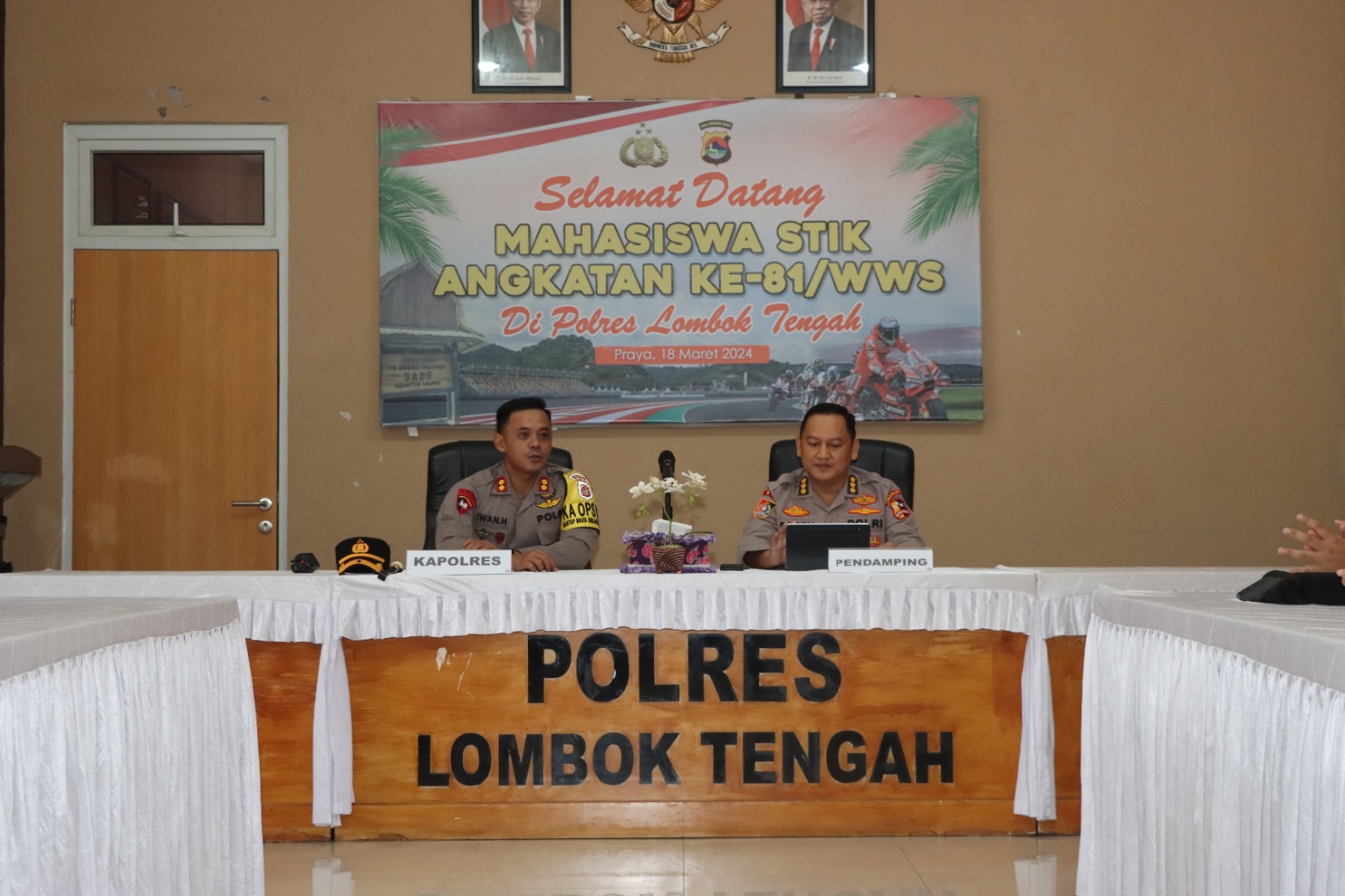Kedatangan rombongan dipimpin oleh pedamping dari Lemdiklat Polri Kombes Pol. Doddy Ferdinand S, SIK., MIK, dan disambut langsung oleh Kapolres Lombok Tengah AKBP Iwan Hidayat, SIK beserta Wakapolres dan para PJU di Alula Polres Loteng, Senin (18/3/2024).