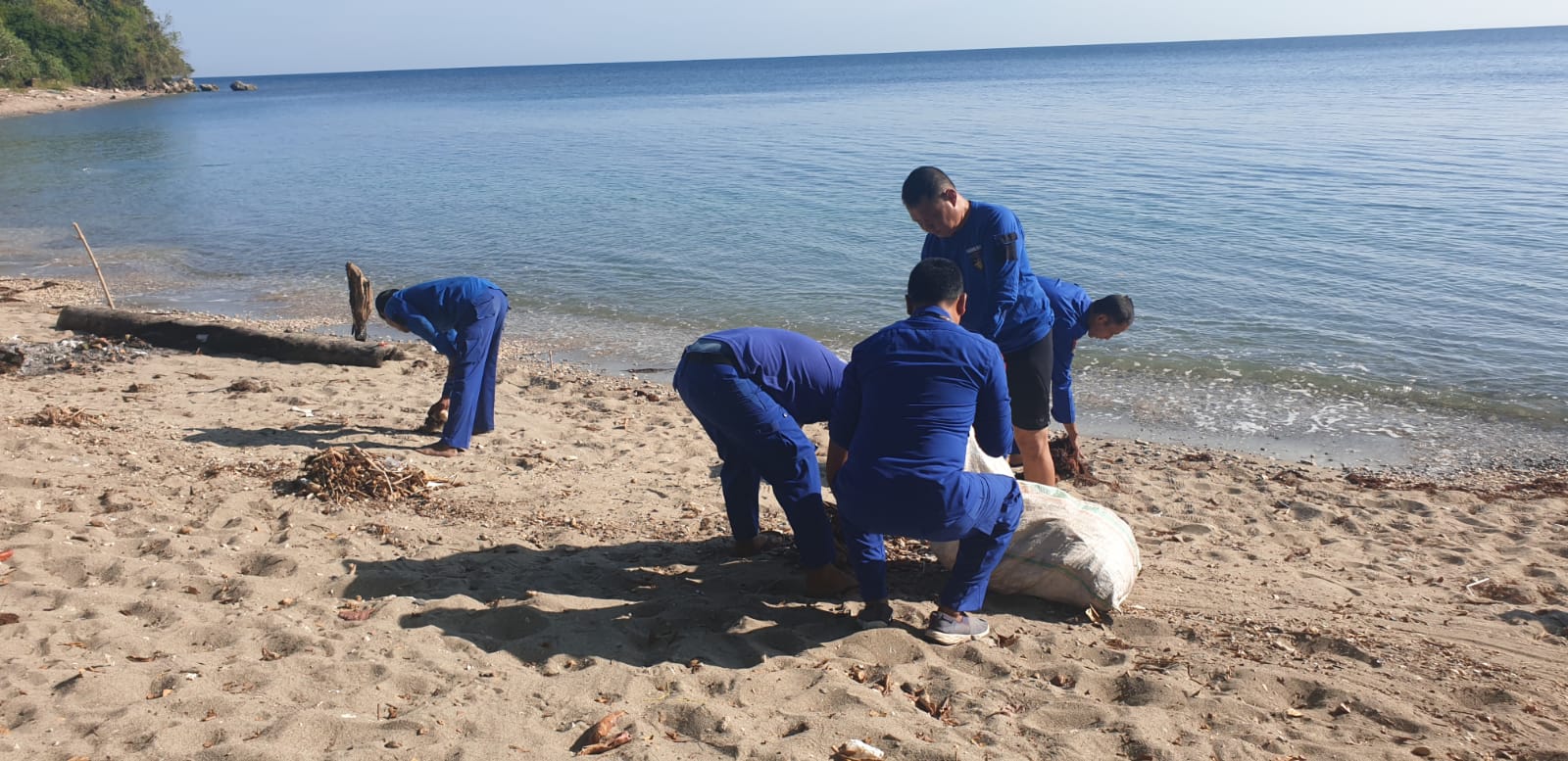 Kegiatan bersih bersih pantai bertempat di Pantai Kencana Kecamatan Labuan Badas dipimpin Kasat Polairud AKP Sumardi, S.Sos bersama personilnya.