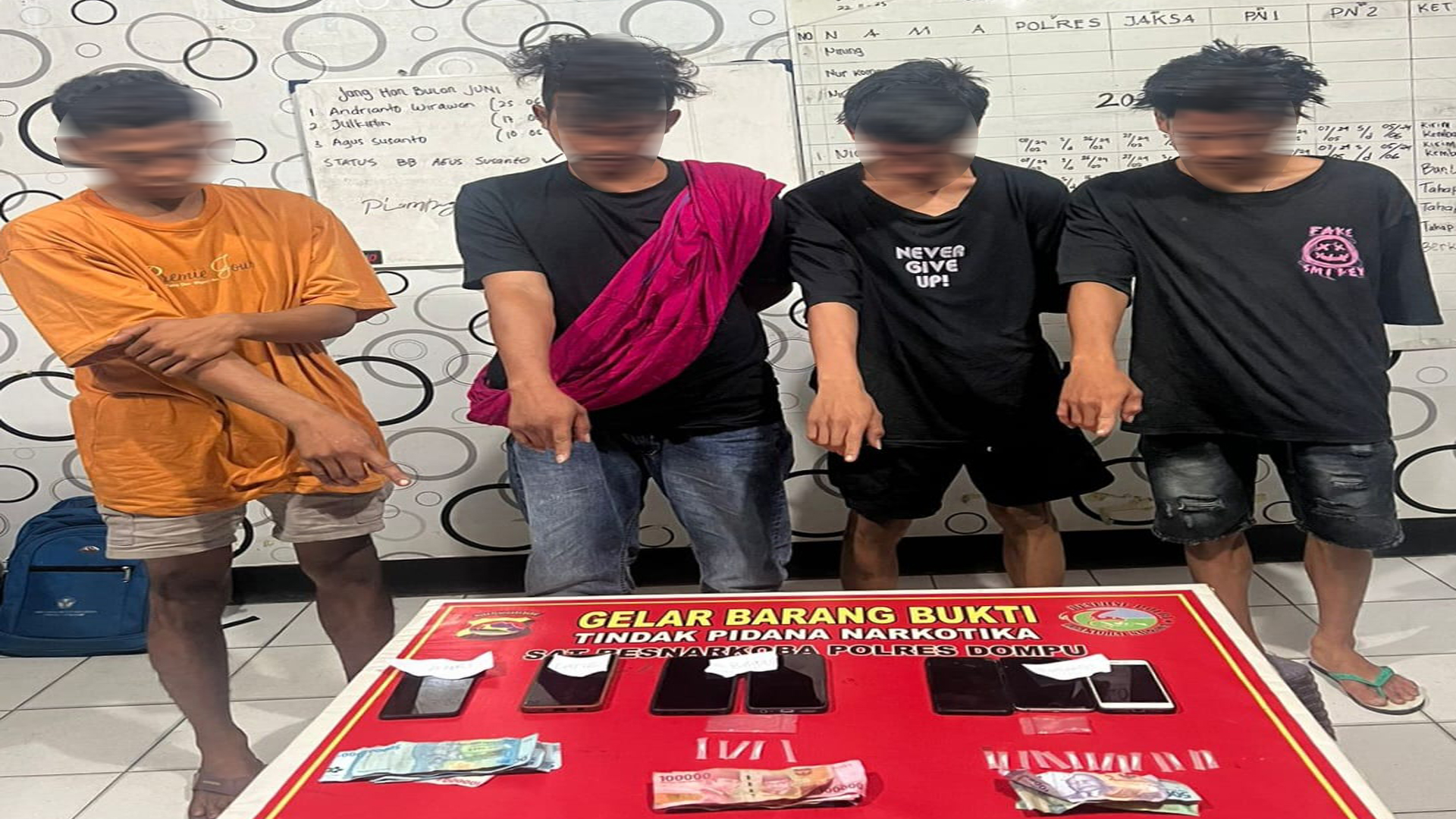 Berdasarkan petunjuk awal, Tim berangkat menuju TKP 1, yakni di salah Satu Rumah Di Dusun Karang Juli, Desa Kadindi, Pekat. Di sini, tim berhasil mengamankan 4 (empat) terduga masing-masing, BA (18), AL (17), AR (27) warga Desa Kadindi dan SN (20) asal Kadindi Barat, Kecamatan Pekat.