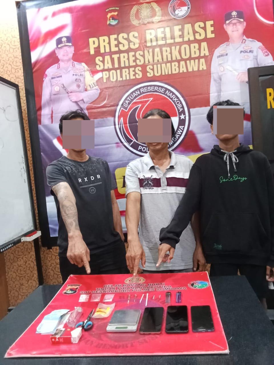 Sumbawa Besar-NTB, Satuan Reserse Narkoba Polres Sumbawa Polda NTB mengamankan tiga pria diduga pelaku dalam tindak pidana penyalahgunaan narkotika jenis sabu pada hari Senin 10 Juni 2024 sekitar pukul 19.30 Wita di salah satu rumah di Desa Jorok Kecamatan Utan.