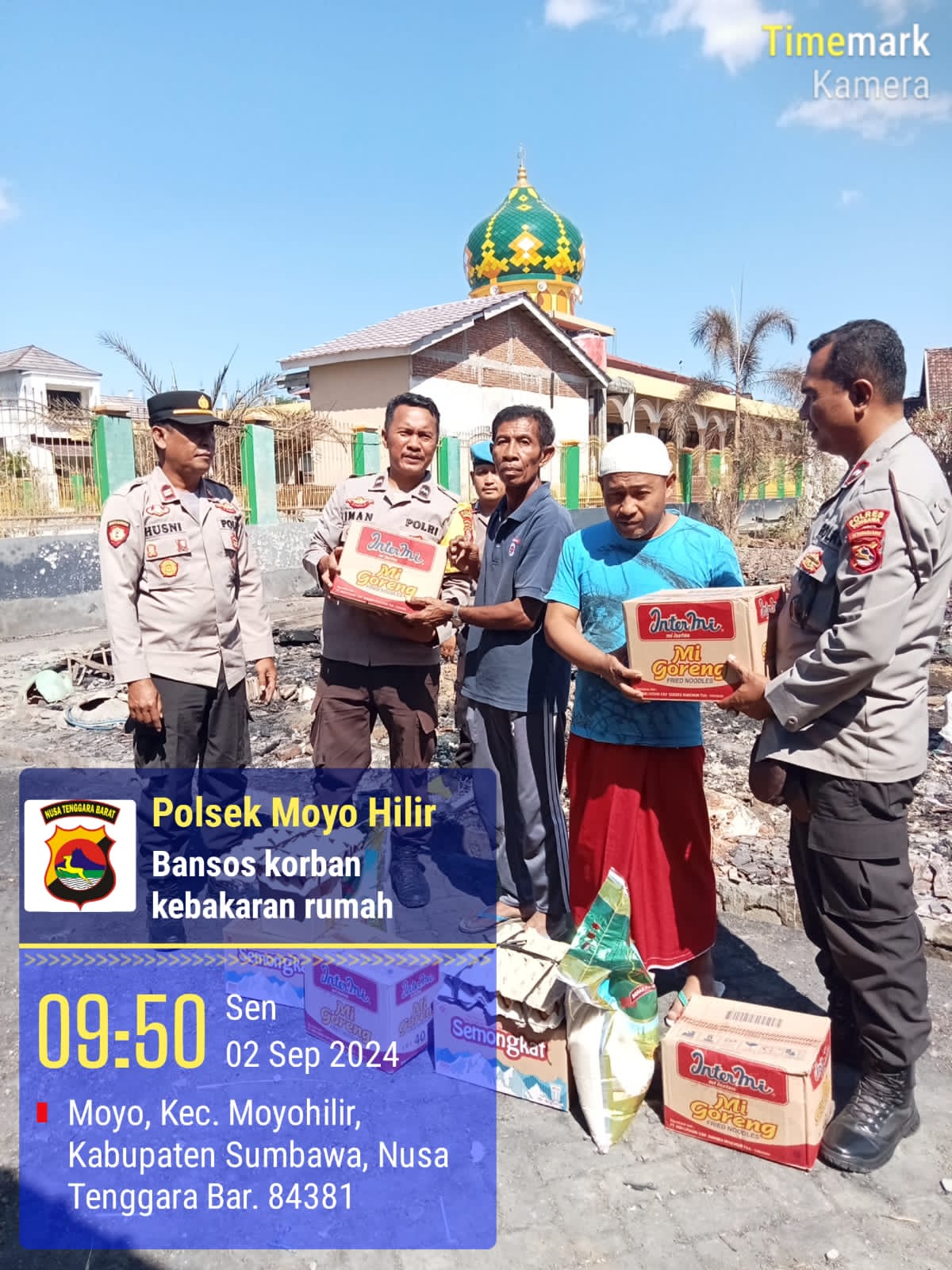 Sumbawa Besar- NTB, Personel Polsek Moyo Hilir jajaran Polres Sumbawa didampingi Bhayangkari ranting Moyo Hilir memberikan bantuan sosial kepada masyarakat yang menjadi korban musibah kebakaran rumah di Desa Moyo Mekar, Senin (02/09/24) pagi.